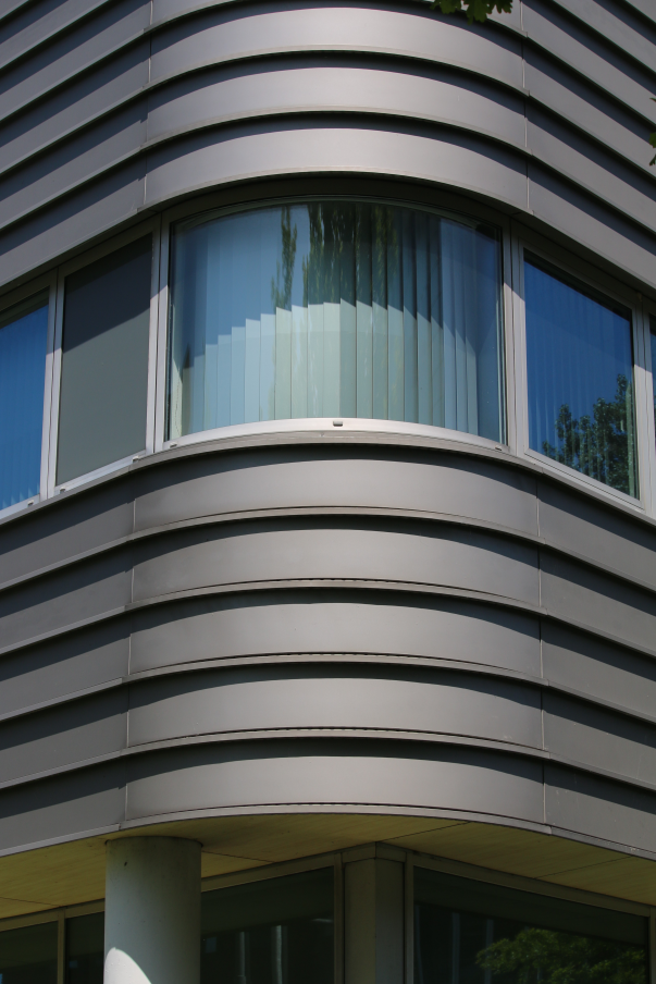 The horizontal orientation of the relief created by the granite joint profiles gives the façade the appearance of enclosing the building like a spacesuit, symbolising the progress central to Kubrick's film. The façade is finished in Colorcoat® SDP 50, in the colour TSN Sydney 9007, providing a smooth, uniform reflection of light on sunny days. The choice of this cladding was based not only on aesthetic considerations but also on its expected lifespan and favorabel price/quality ratio. Additionally, a pre-painted steel façade of Colorcoat SDP 50 requires minimal maintenance, primarily for aesthetic purposes.